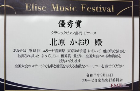 ピアノコンクールファイナル、2名の生徒さん入賞おめでとう